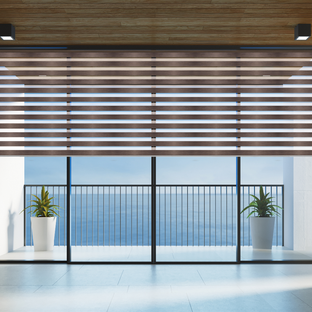 ستائر زيبرا (Zebra Blinds): مزيج ذكي بين الشفافية والعتمة، تتيح لك التحكم في الضوء بسهولة مع مظهر أنيق يناسب المكاتب الحديثة.