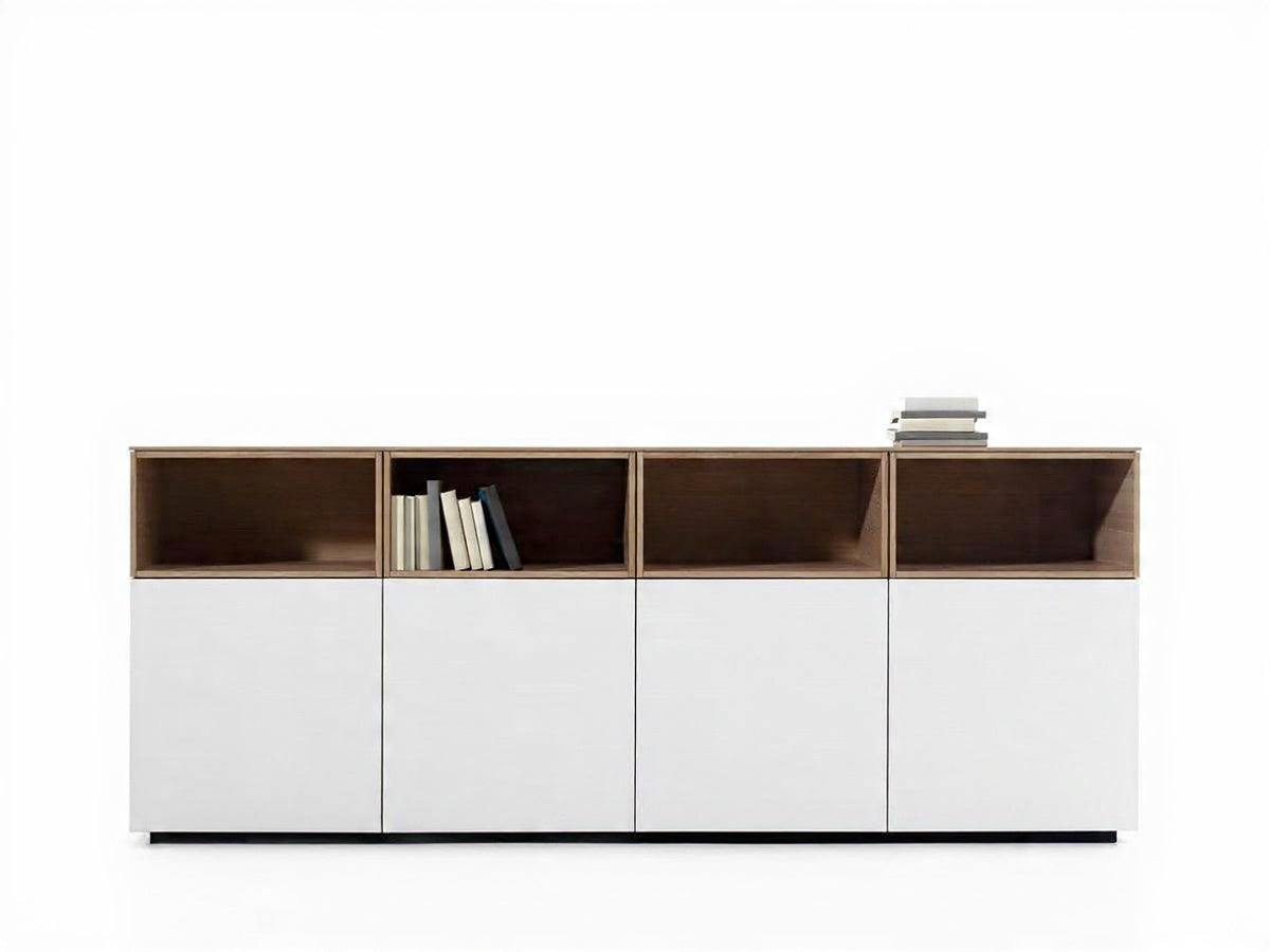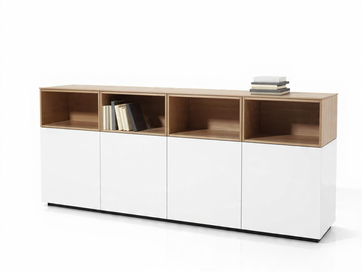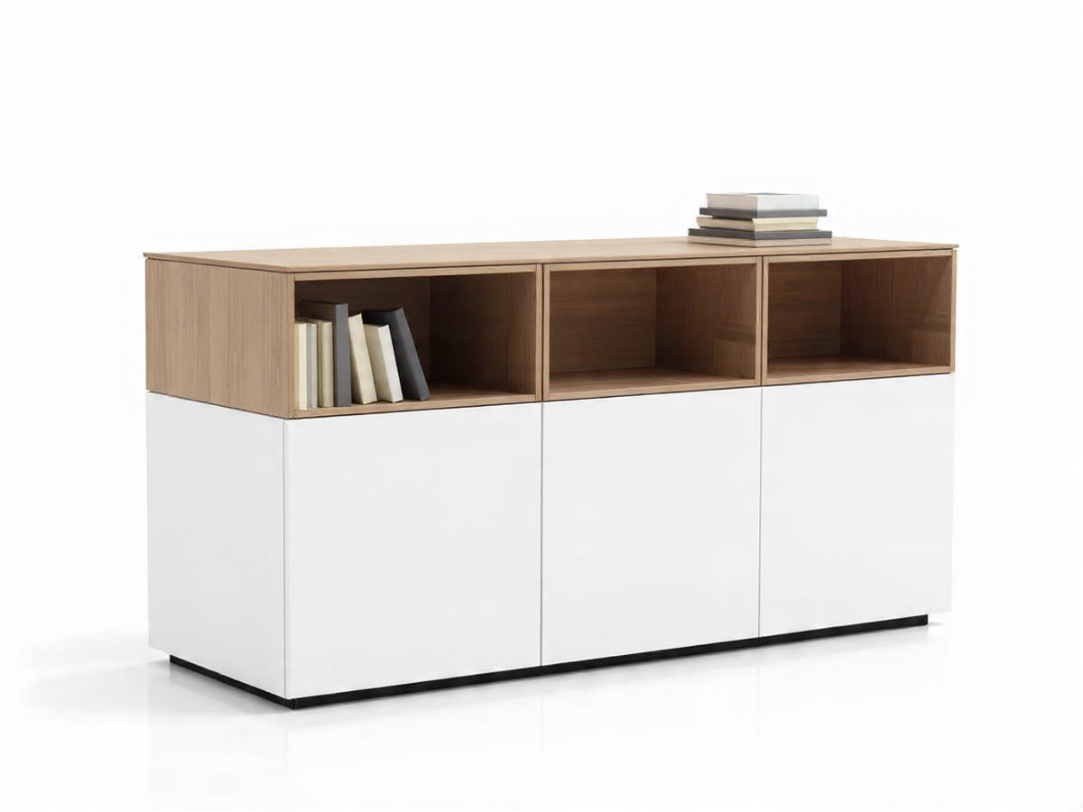 تصميم متوازن يجمع بين الأدراج ووحدات التخزين المفتوحة أو المغلقة.